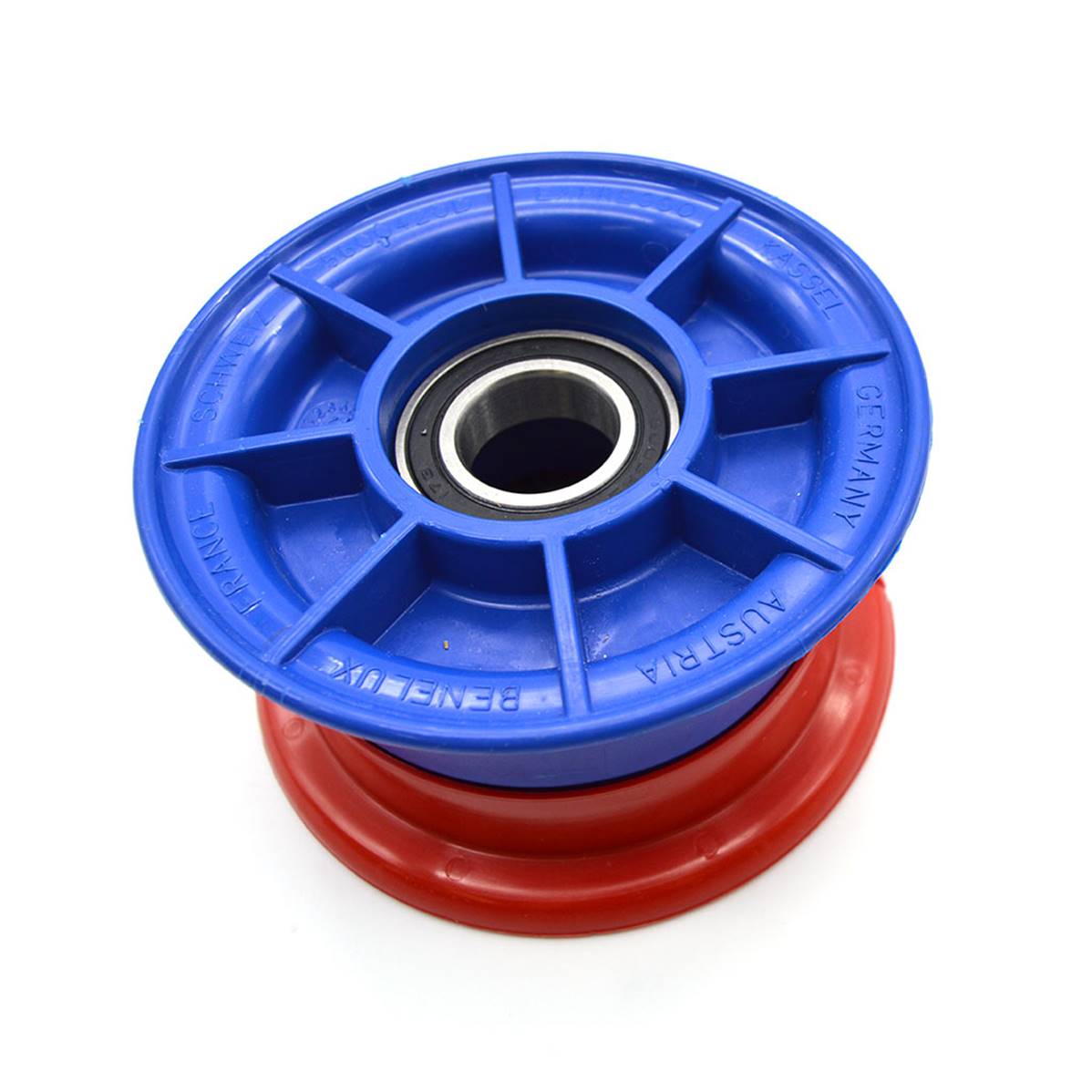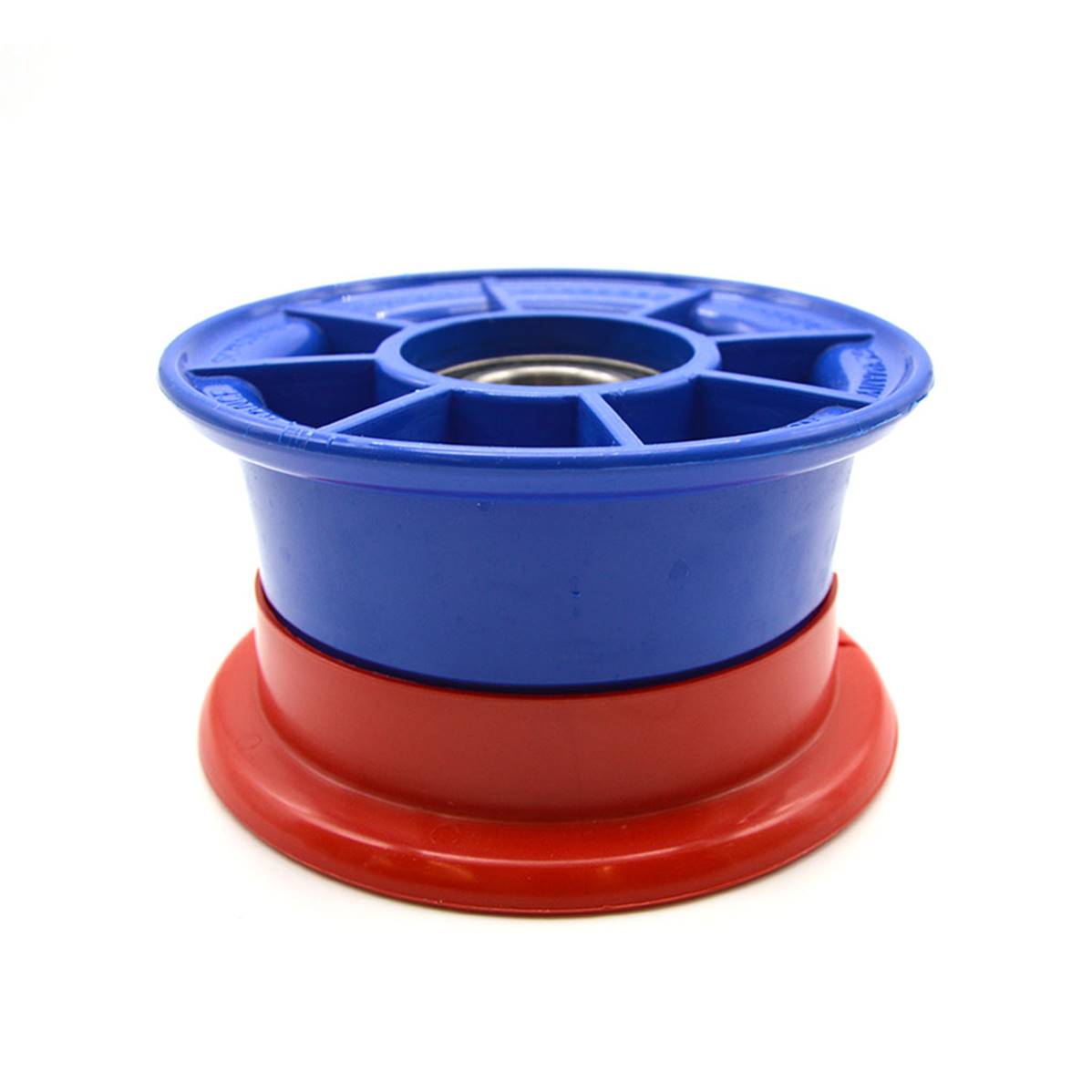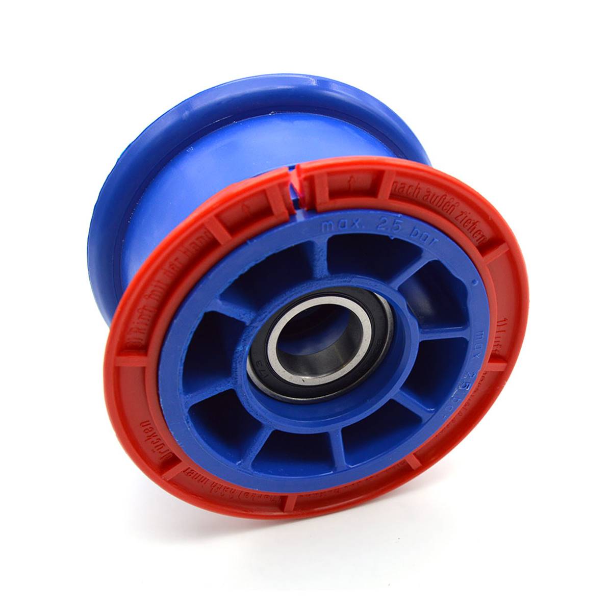 Plastic 4’ wheel rim without demountable brake. The ball bearing range is 46 mm on a 25 mm diameter axis...