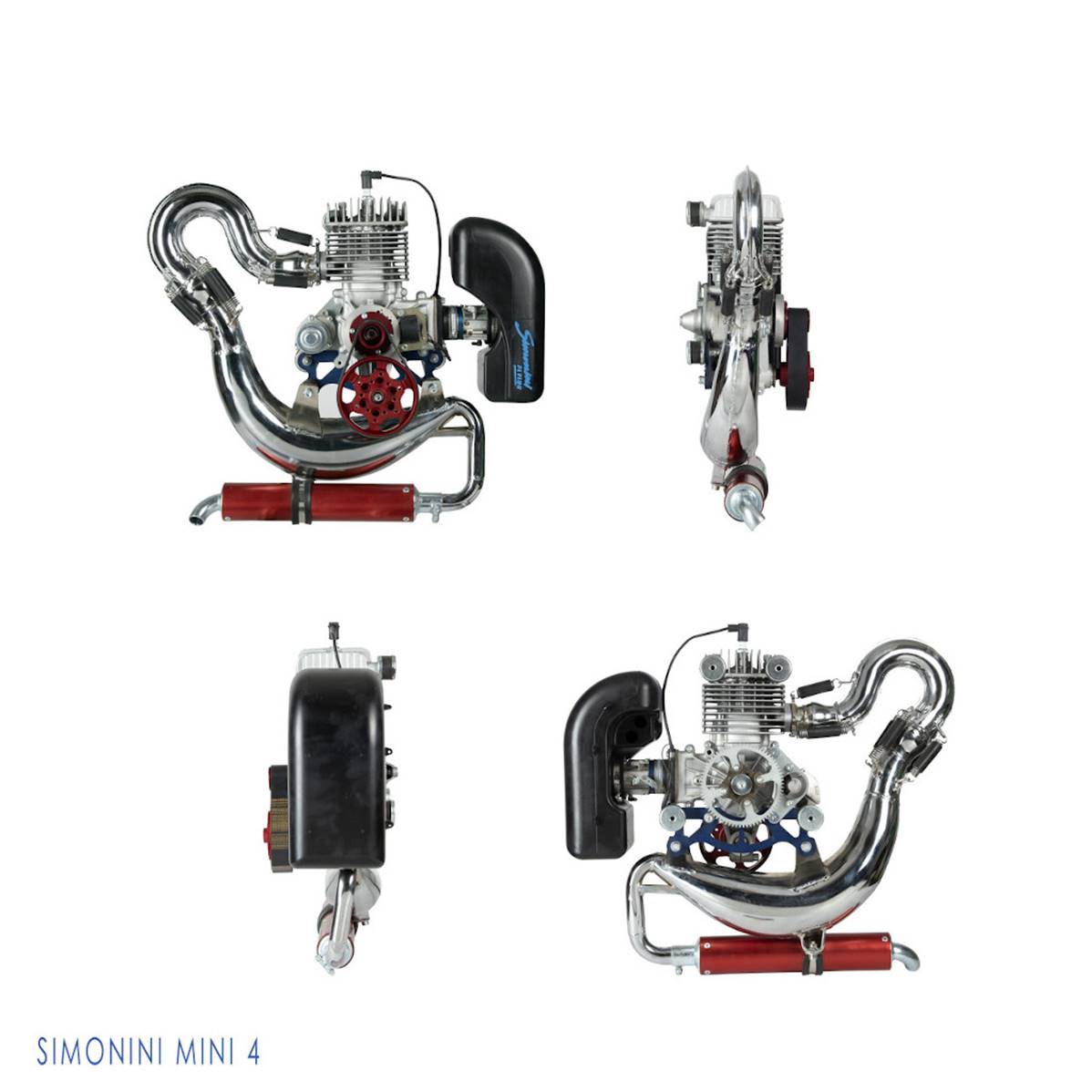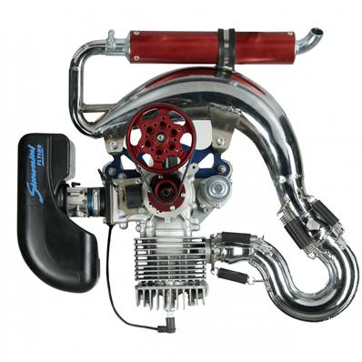Mini 4 Plus Simonini engine including : the Poly V belt reducer with electric starter, the WALBRO WB 37 carburetor, the air filter and the exhaust pipe. Type 2T single-cylinder, air cooling system, rotating direction: counterclockwise seen from the propeller side. Cylindered 164 CC. Cylinder made with alloy treated with Nikasil. Speed x bore: 54,5 mm x 62 mm. Compression ratio: 11/1. Performance: 20 CV on 7200 lap/min. Lubrication: Fuel/3% oil mixture. Fuel: 95 Euro. Starter: IMD transductor. Carburetor with WALBRO WB37 air filter. Electric starter. Exhaust: Yes. Poly V 1/ 2,248 or 1/ 2,70 or 1/ 2,98. Full weight: 12kg