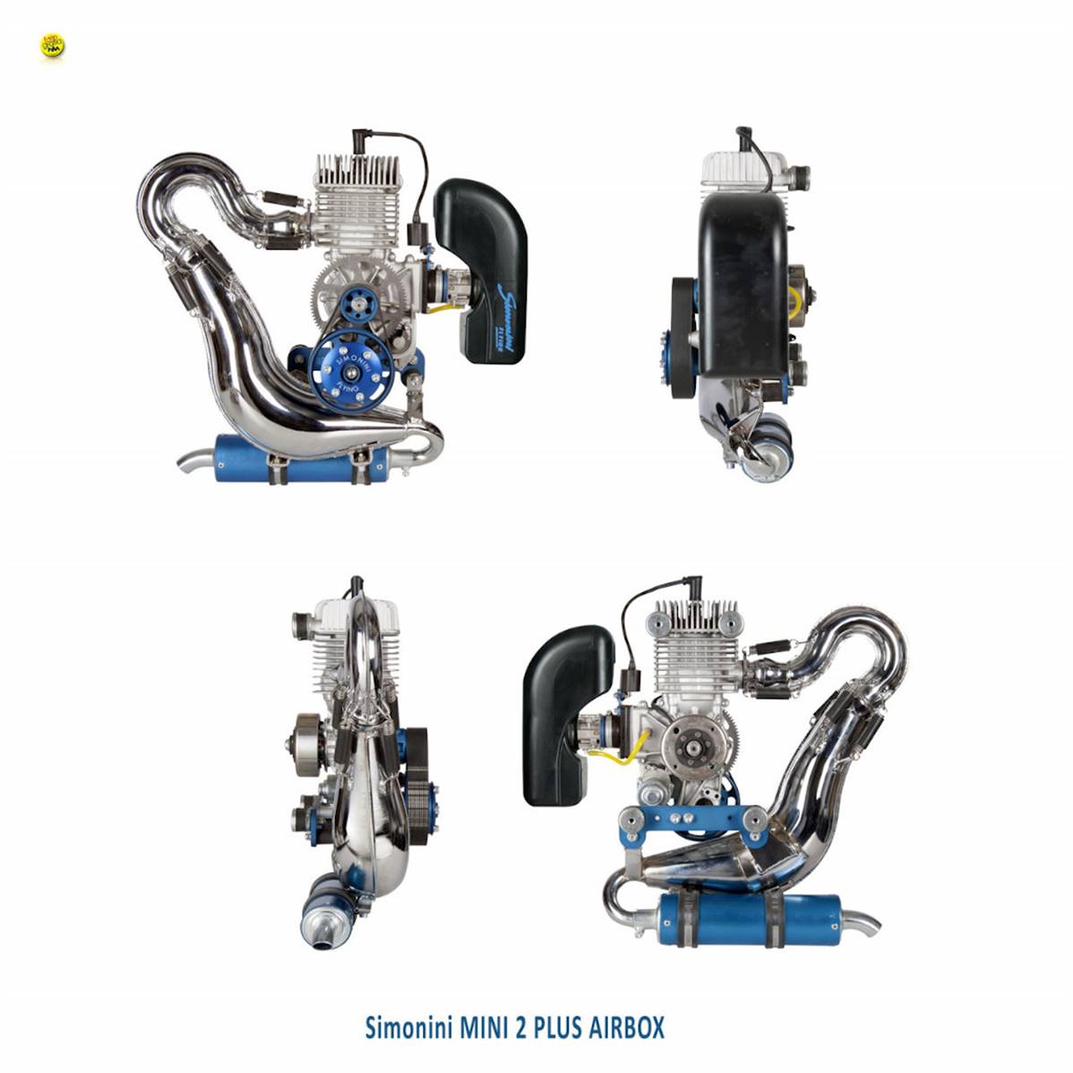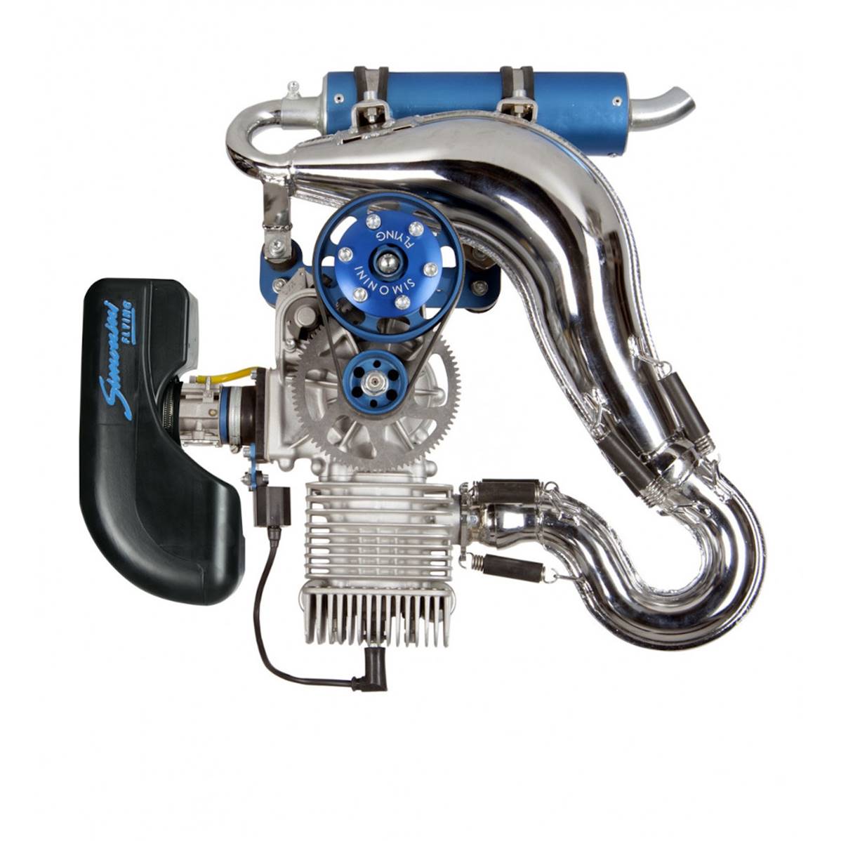 Engine SIMONINI Mini 2 Plus, full including : the strap reducer Poly V with 250W electric starter, the WALBRO WB 37 carburetor and air filter, the exhaust pipe and 12V charge regulator. Type 2T single cylinder, air cooling system. Rotating direction counterclockwise seen from the side propeller cylindered 202 CC. Alloy cylinder treated with Nikasil. Speed x bore 58 mm x 66,4 mm. Compression ratio: 10,50 / 1 Performance 25 CV on 7500 lap/min. Lubrication fuel/oil 3% mixture. Fuel Euro 95 starter. IDM transducer. Carburetor with WALBRO WB 37 air filter. Electric ignition: Yes. Belt reduction Poly V 1/ 2,34 or 1/ 2,226 or 1/230 or 1/310. Full weight: 16 kg