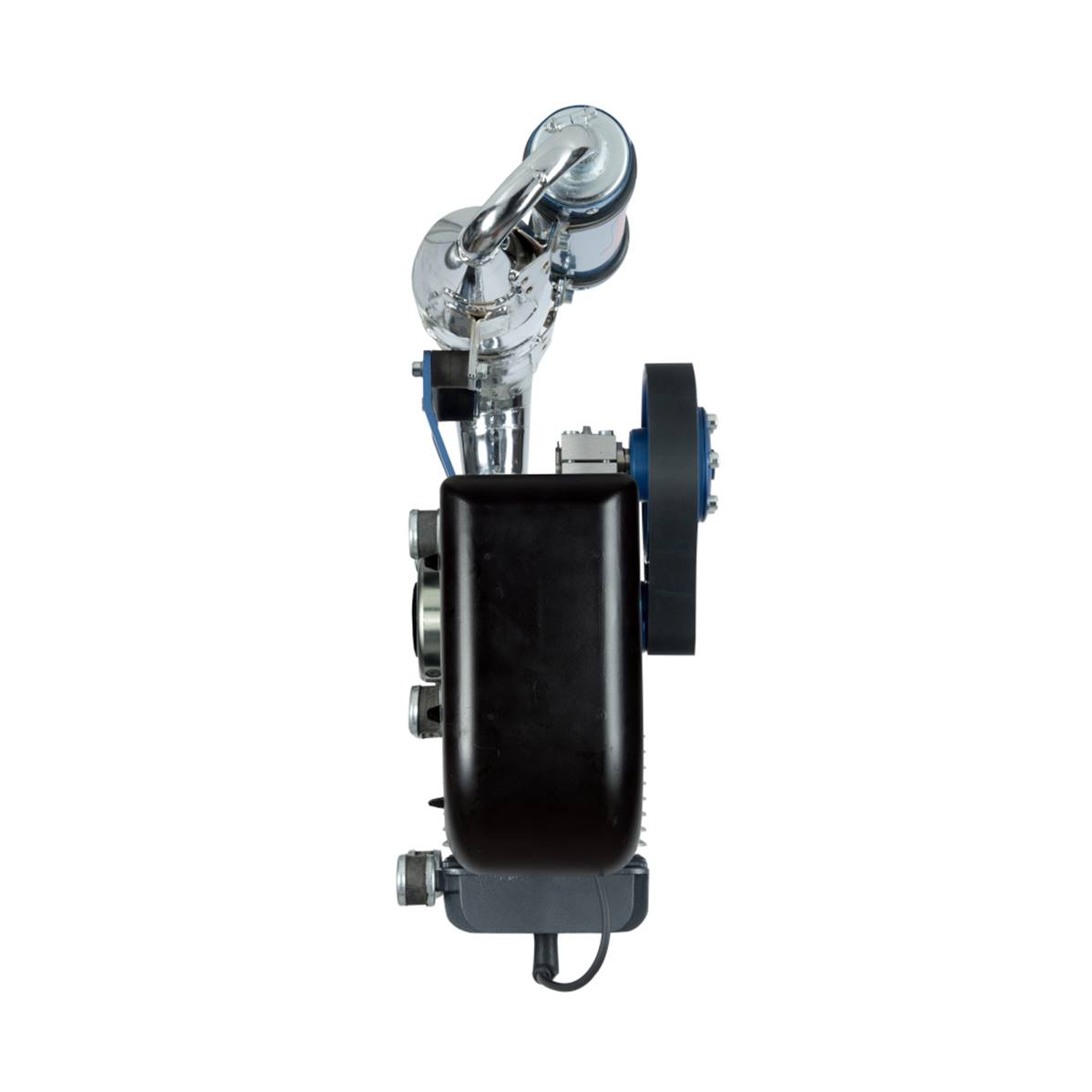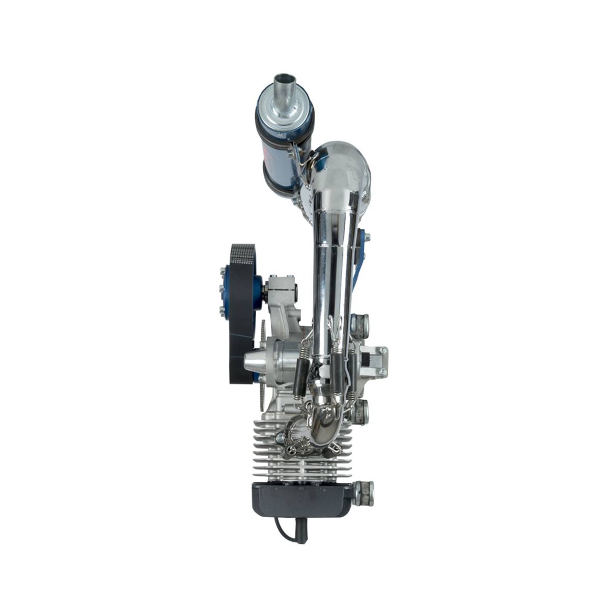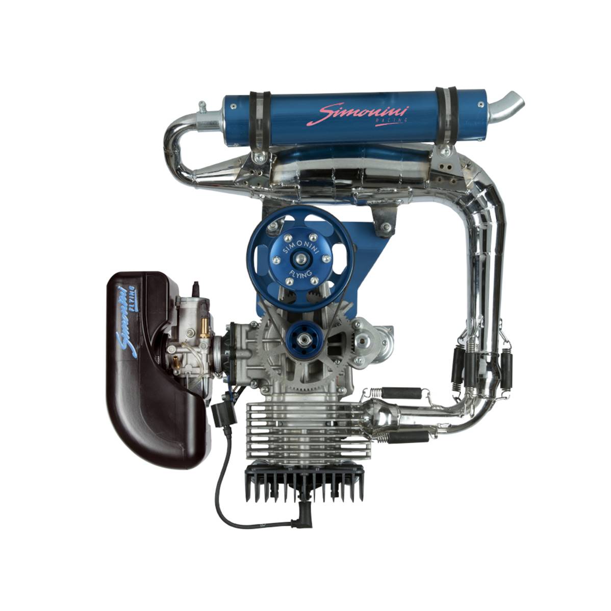 MINI3 Simonini engine, including an exhaust pipe, the BING 36 carburetor, the air filter, the electric starter, and the 1/276 reducer. Type 2T, single cylinder, air cooling system. Rotating direction: counterclockwise seen from the propeller side. Cylindered 270 CC. Cylinder made with alloy treated with Nikasil. Speed x bore: 65 mm x 72,8 mm. Compression ratio: 10,50/1. Performance: 33 CV on 7000 lap/min. Lubrication. Fuel / oil 3% mixture, Euro 95 fuel. IDM transductor starter. Carburetor with Bing 36 air filter. Electric starter 12 V – 400w. Exhaust: Yes. Poly V 1/ 2,76 or 1/ 2,49 or 1/ 2,57 belt reducer. Full weight: 18 kg, packaged weight: 35 kg.