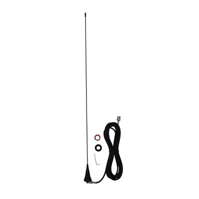 External antenna for aeronautic radio with color BNC on black connectors. Frequencies range: 108…960 MHz tunable by cutting. Impedance: 50 Ohm Radiation: Omnidirectional – Polarization: vertical Gain: 0 dB ref to ¼ whip Max. Power: 100 Watts Feed system / position: Direct/base Standard mount: ‘ML’ mounting hole diam 14 or 18 mm. Mechanical characteristics: highness (nearly): 700 mm Weight (nearly): 280g Rode length: 5m