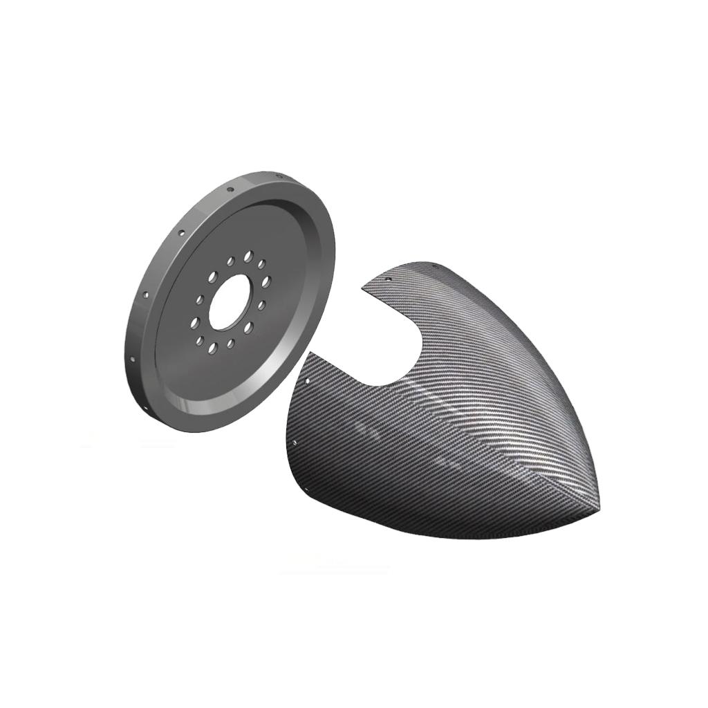 The mounting plate for the 210 mm three-blade DUC cone is entirely made of carbon fiber with an overall thickness of 3 mm.