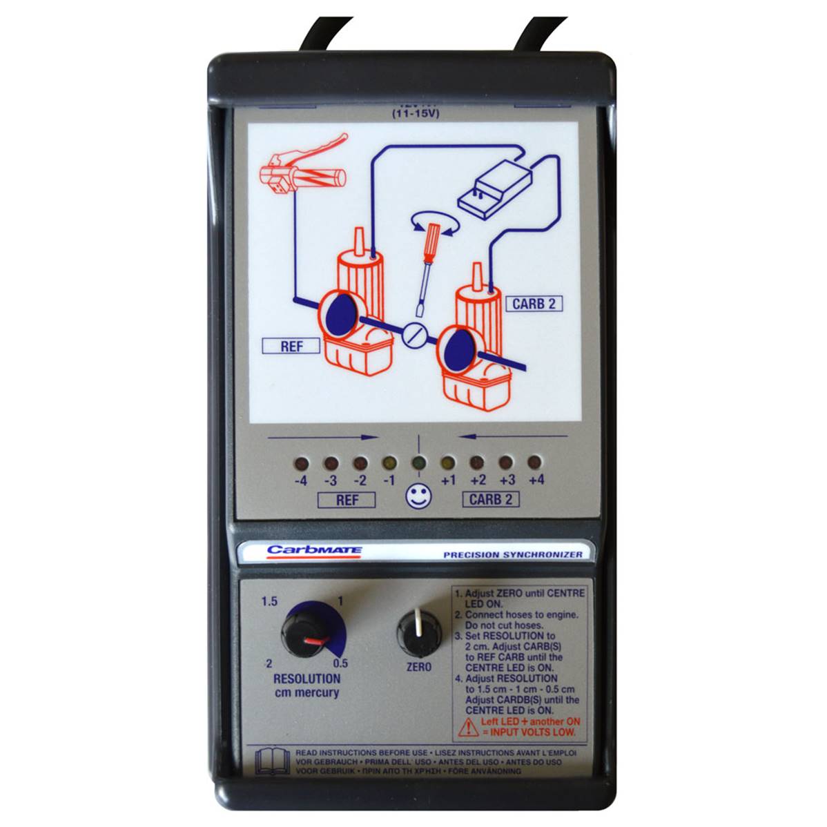 The resolution is adjustable from 0.5cmHg to 2cmHg, allowing increasing precision until perfect synchronization is achieved. Display on a row of 9 horizontal LEDs.