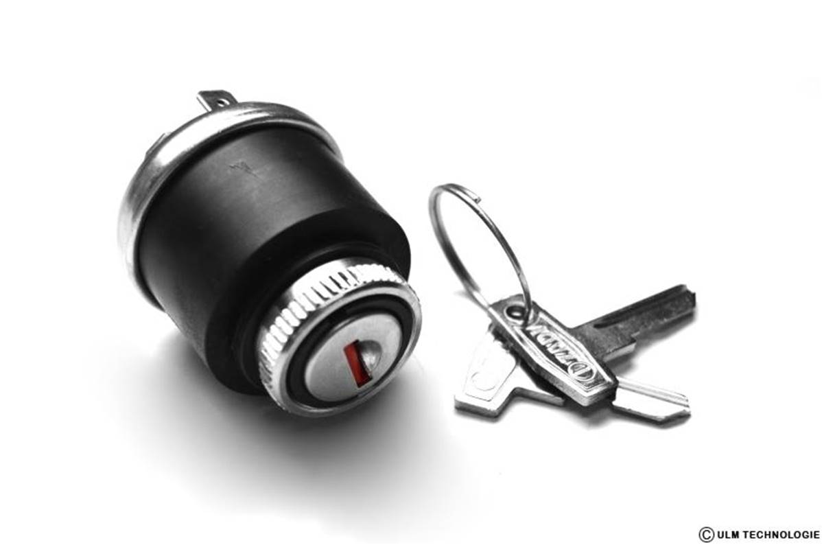 Key contactor 3 positions (Stop, power up and starter). Weight: 85g. INT Terminal: battery entry: Terminal 50; to the starter relay: Terminal 30; instruments alimentation: Terminal 15; separated circuit: Terminal 30/1 (for example for a lamp which indicates power-up). During the tensioning, contact between terminals “-30” and “-30/1”. During the start-up, contact between terminals “-30 – 50” and “-30/1”. Drilling diam: 22 mm