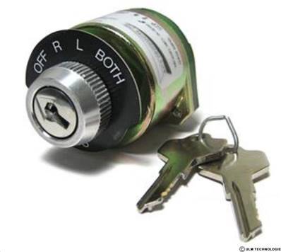 Double ignition key contactor provided on two separated circuits. The control function of the tape recorder (right, left and both) and the starter activation function. The contactor can be settled in a 2.22 cm whole. Provided with 2 keys: available with the ignition function.