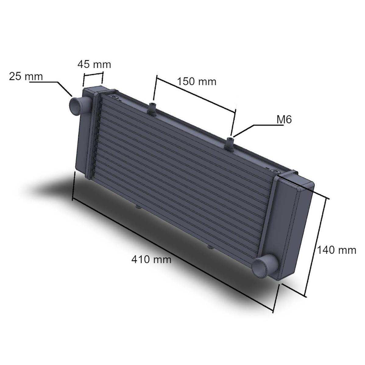 Water heating without extension. Welded vacuum aluminum heating extremely light (0.860 kg). Equipped with fixation points. Extension system nonintegrated. An overflow tank is advised (ref 70542) and an expansion vase (ref A 000 160 / 161 in this section). Fits for every 4 times motor if the air flow is appropriate. (See the motor settling manual). Input and output diam: 25 mm. Necklace are available in the section Necklace and hose. Dimensions: L: 415 mm x H: 142 mm – Weight: 860 gr – Sold by unit