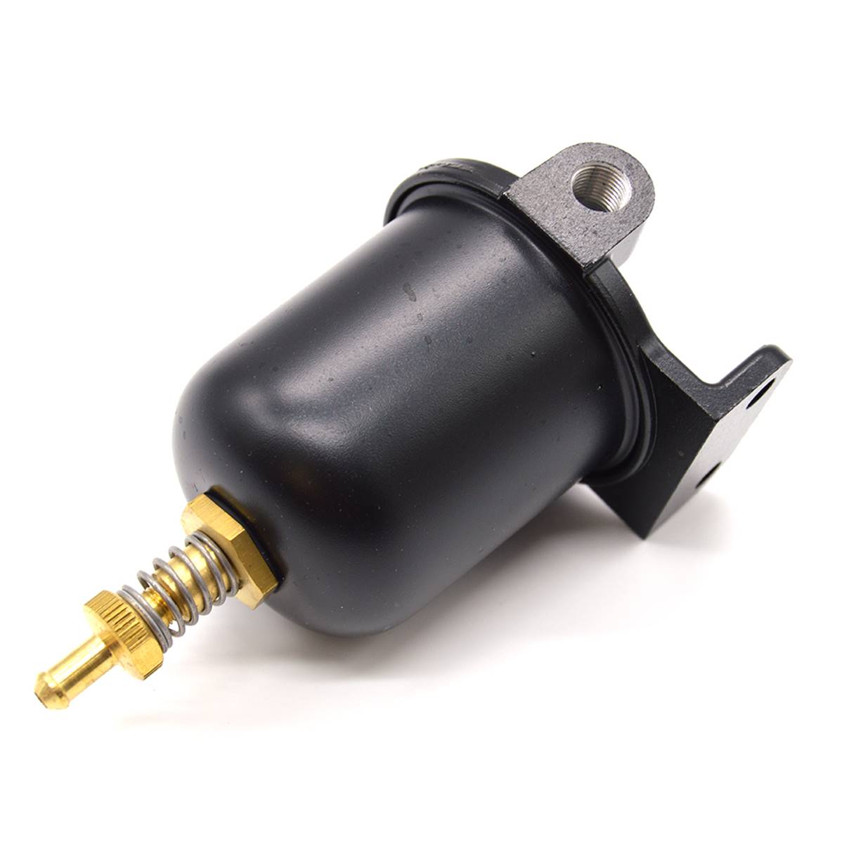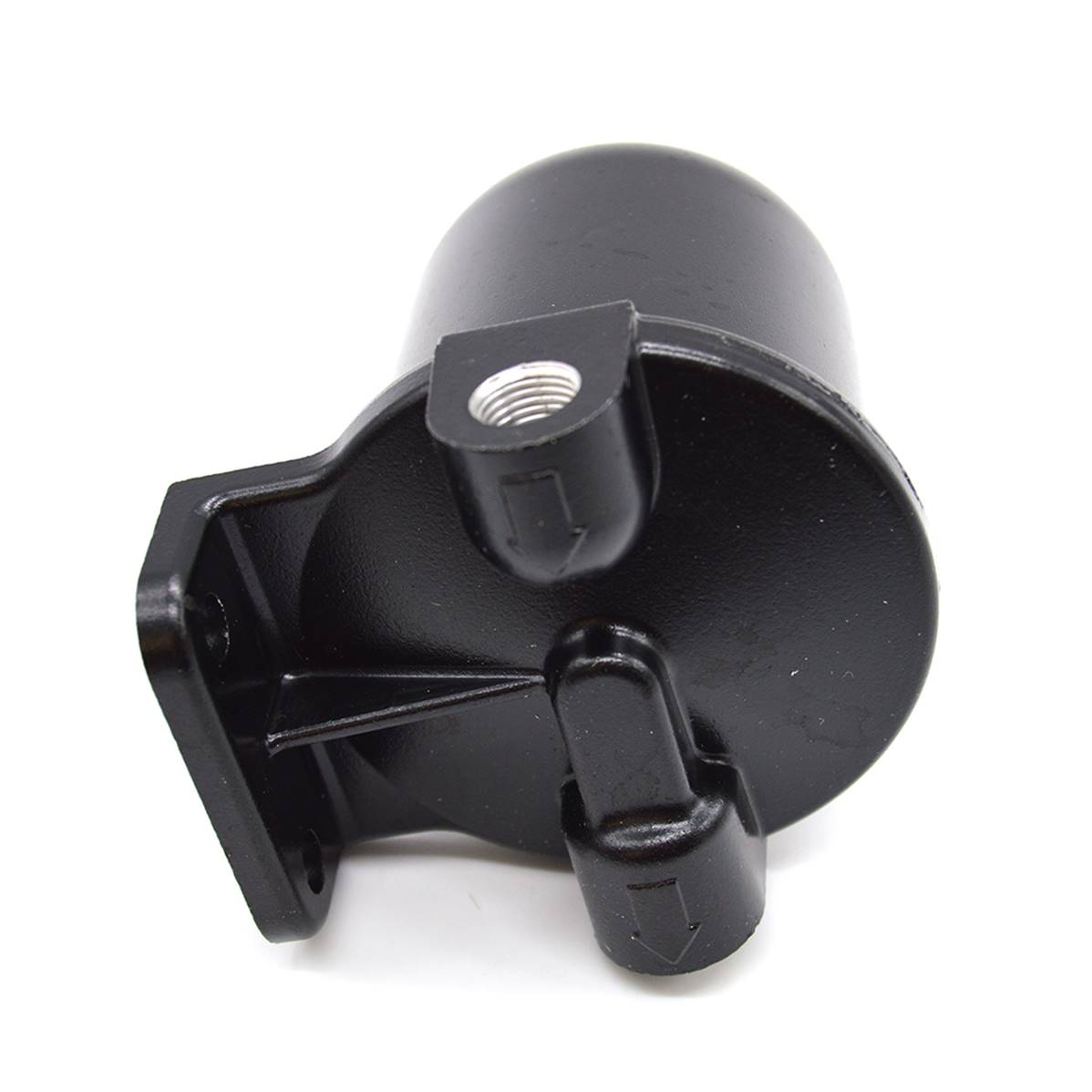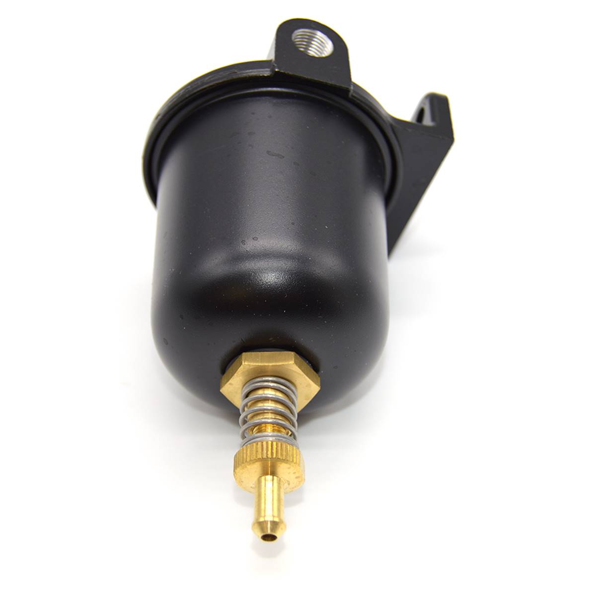 Decanter filter with output purge, female, 1/8’, allow to mount a tip for 6, 8 or 10 mm interior diam fuel pipe. Full height: 124.30 mm, width: 63.50 mm, jar height: 60 mm, jar diam: 55 mm, tip height: 41 mm, 2 6 mm holes with center-to-center distance of 31 mm