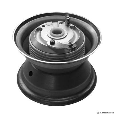 Demountable aluminum wheel rim with a 105 mm diameter DX drum brake (lever on the right) and a 70 mm hub made by alloying aluminum. Rolling fit for a 25 mm axis.
