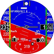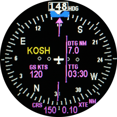 The HSI display, when connected to GPS via the Nmea output, provides current position, direction, distance when a GoTo or flight plan is activated; when not connected to GPS, it is a gyrodirectional display.