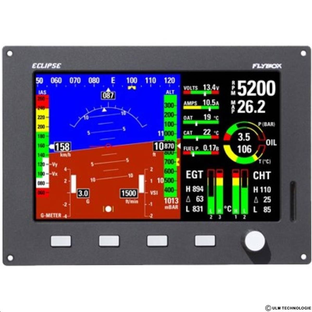 IFIS Fly Box Eclipse for 912 / 914 motor (delivered without sensor). EFIS allows a complete management of every settings of the motor. There are 28 functions in only one device; the color screen is really seeable. The clear and compact arrangement of information make this device the one and only in its category. Flight principals characteristics: Artificial horizon / Altimeter (m or ft) / Air speed indicator (km/h) or variometer (m/s or Ft/min) / VSG G (m with maxi compass) / Atmospheric pressure / 3 video inputs for color cameras / Vocal checklist / GPS receptor included / Audio intercom output / Turning coordinator / Data recording bead. Motor principal characteristics: EIS displays data from the motor, fuel, and other functions: MAP (Manifold Absolute Pressure) Oil pressure indicator / Oil temperature indicator / 6 entries fuel indicator CHT / EGT voltmeter. For your safety, when an instrument reaches the limit, it is possible to activate a visual and sonic alarm (audio output) / OAT (Outside Air Temperature): measures the outside air temperature CAT (Carburetor, AIrbos Air Temperature): measures the system and the carburetor temperature. Fuel indicator computer: measures the fuel rate, toughness, the rest of fuel, the burned fuel, the range and the destination tank. It is possible to activate 3 alarms for the rest of fuel, the time before resupply, and the possibility to balance tanks. Ammeter 4 entries for fuel level sensors / 3 entries video color camera / Battery tension / Battery charge / Data recording function