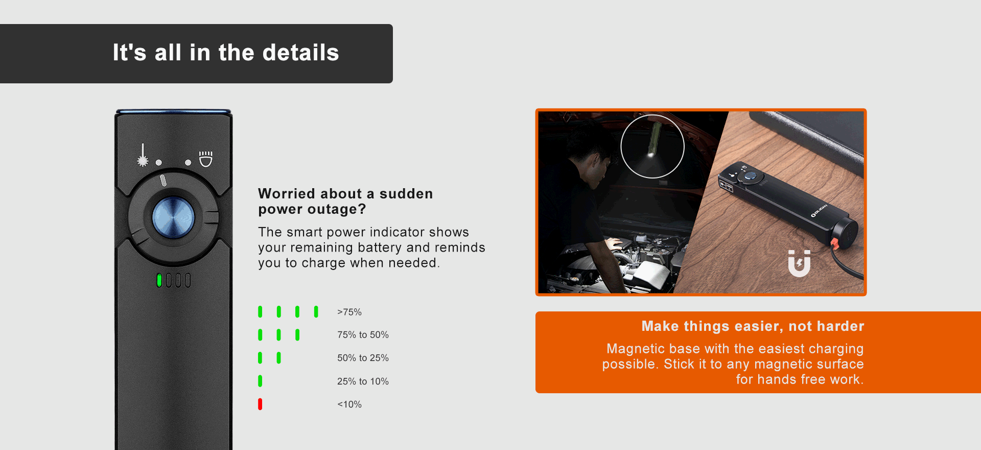 Easily recharge it with its magnetic charging cable. With its flat design and excellent portability, the Arkfeld is an essential EDC flashlight, combining power, style, and practicality for your lighting needs and beyond.