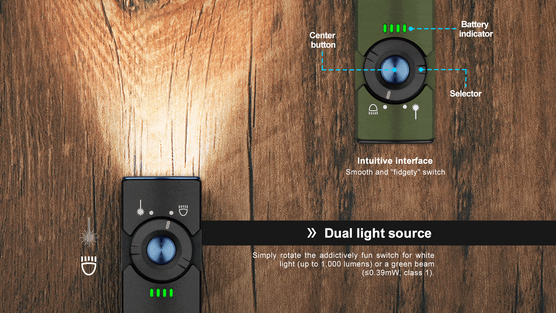 5 brightness levels up to 1000 lumens with memory function. Green laser for pets or presentations. Two color temperatures (cool white and neutral white).