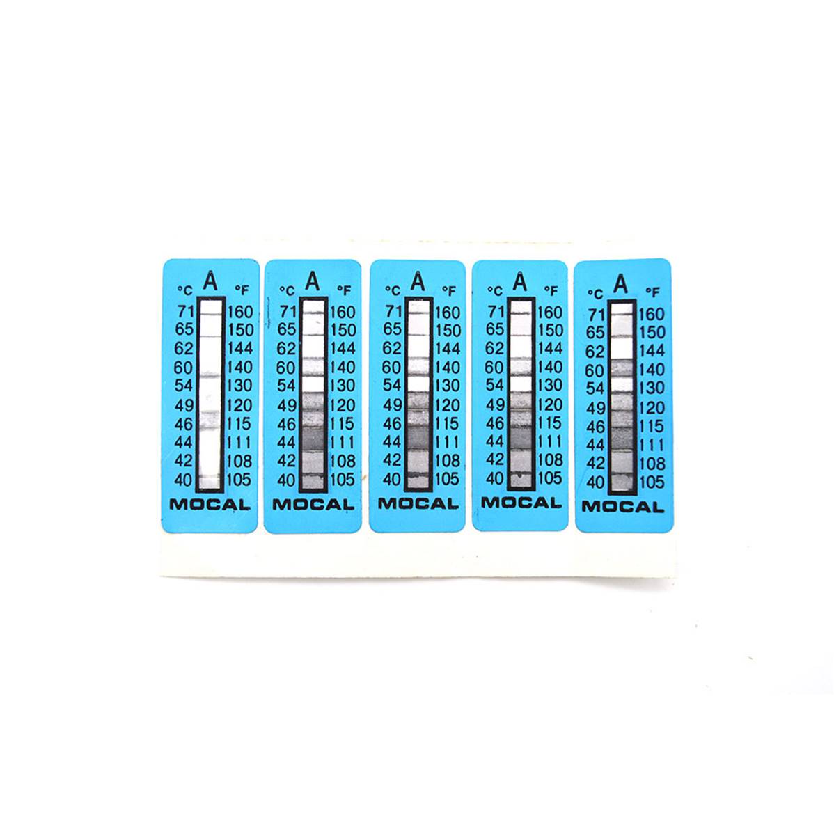 Temperature indicator irreversible tag. Measure range: 37 – 65°C – 5 pieces lot – Take off the paper support of the indicator. Applicate the whole on a dry and clean surface making sure the entire indicator is in contact with the surface. The black permanent change indicates that the temperature corresponding on the indicator has been reached.