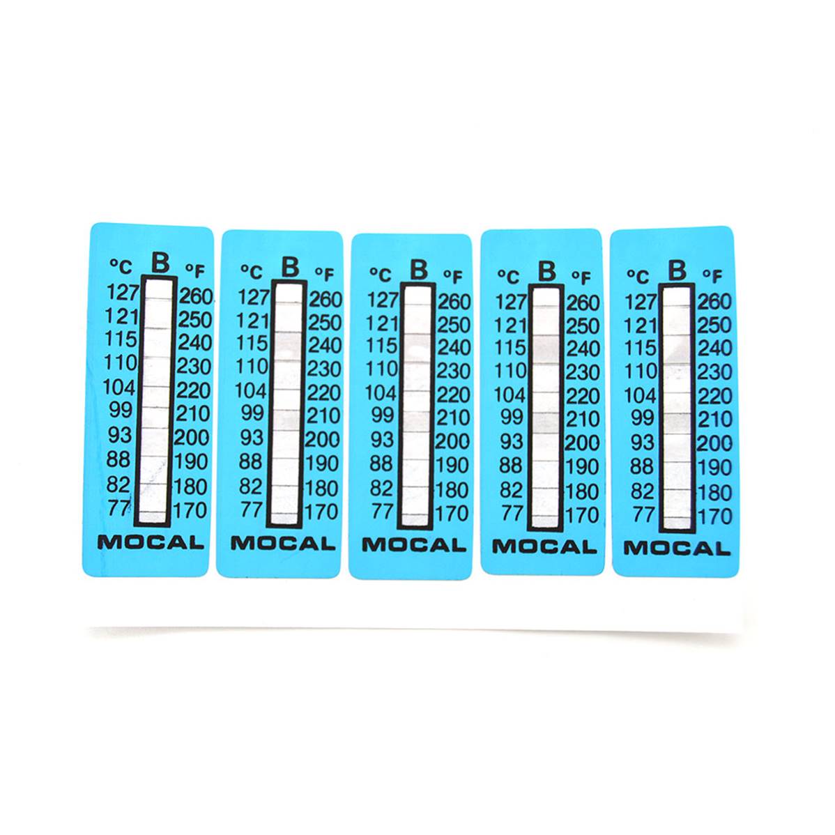Temperature indicator level irreversible tag. Measure range 77-127°C (5 pieces). Take off the indicator from the support. Applicate the whole on a clean and dry surface making sure that the whole indicator is in contact with the surface. The black color permanent change indicates that the temperature corresponding on the indicator has been reached.