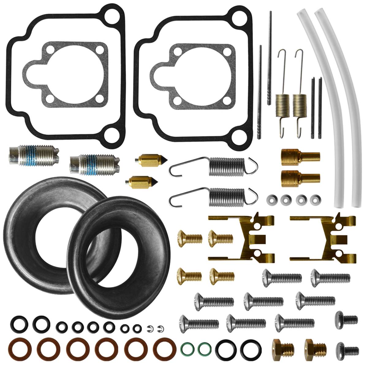 Repairing kit for two Bing 64 carburetors for motor rotax 912 UL 80 CV without float. This kit includes: 2 membranes, 2 vessel joints, 2 starters flat joints, 2 o-ring joints for the mixing tube (8x2), 4 o-ring joints screw wealth + slow nozzle (3.17 x 1.78), 2 starter green o-ring joints, 2 axis throttle o-ring joints (6 x 2), 2 primer hoses (13 cm), 2 blocking needle o-ring joints, 2 nozzles 155, 2 wells 2.70, 2 needles + clips, 2 aluminum stop screws, 2 needles + clips, 2 forks + axis, 6 copper banjo joints (8 x 12), 2 starter springs, 2 gas springs, 2 starter carter screws, 2 under carburetor screws, 4 throttle screws, 2 plastic sockets on gas bellcranck, 2 gas plastic sheets.