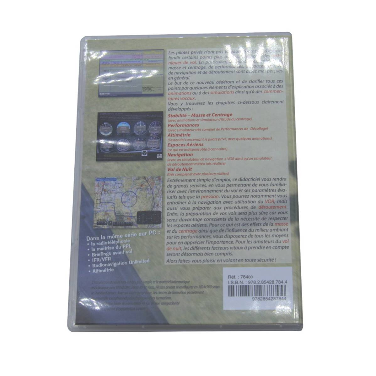 The key points of the PPL and the basics certificate. Private pilots don’t always have the opportunity to deepen a few points more or less delicate to flight technics. Particularly, mass and centering essential notions, performances, aerial spaces, navigation and deviation are badly seen in general. The goal of this new CD-Rom is to clarify every point thanks to explication elements associated to animations or simulations and vocal commentaries. You’ll find chapters below clearly developed: Stability – Mass and Centering (with animation and centering study simulator) – Performances (with full take off performance simulation) – Altimetry (everything about the private pilot, with many animations) Aerial spaces (which is a must-known) – Navigation (with navigation simulator + VOR and a really realistic weather dimension – Night flight (really full + videos)
