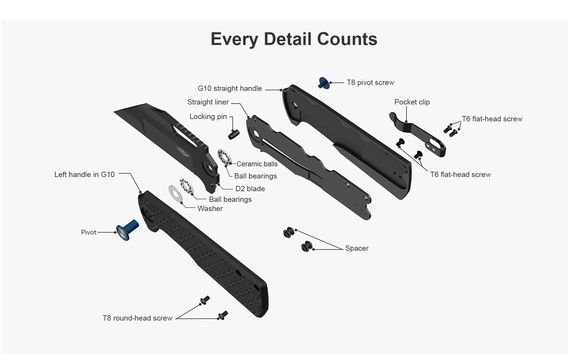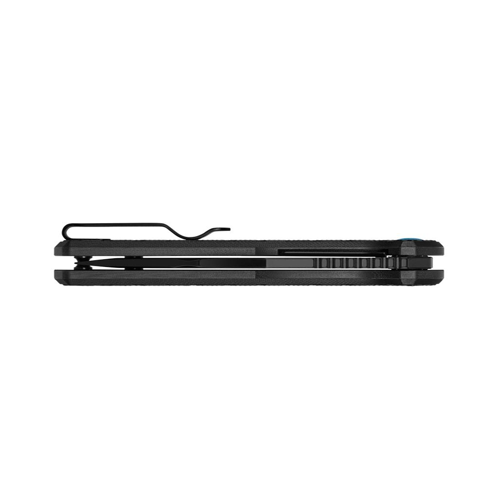 The G10 handle, inspired by the shape of a rifle stock, is CNC-machined with precision. It features a raised parallelogram pattern and a textured matrix finish, delivering both a rugged look and a secure grip.