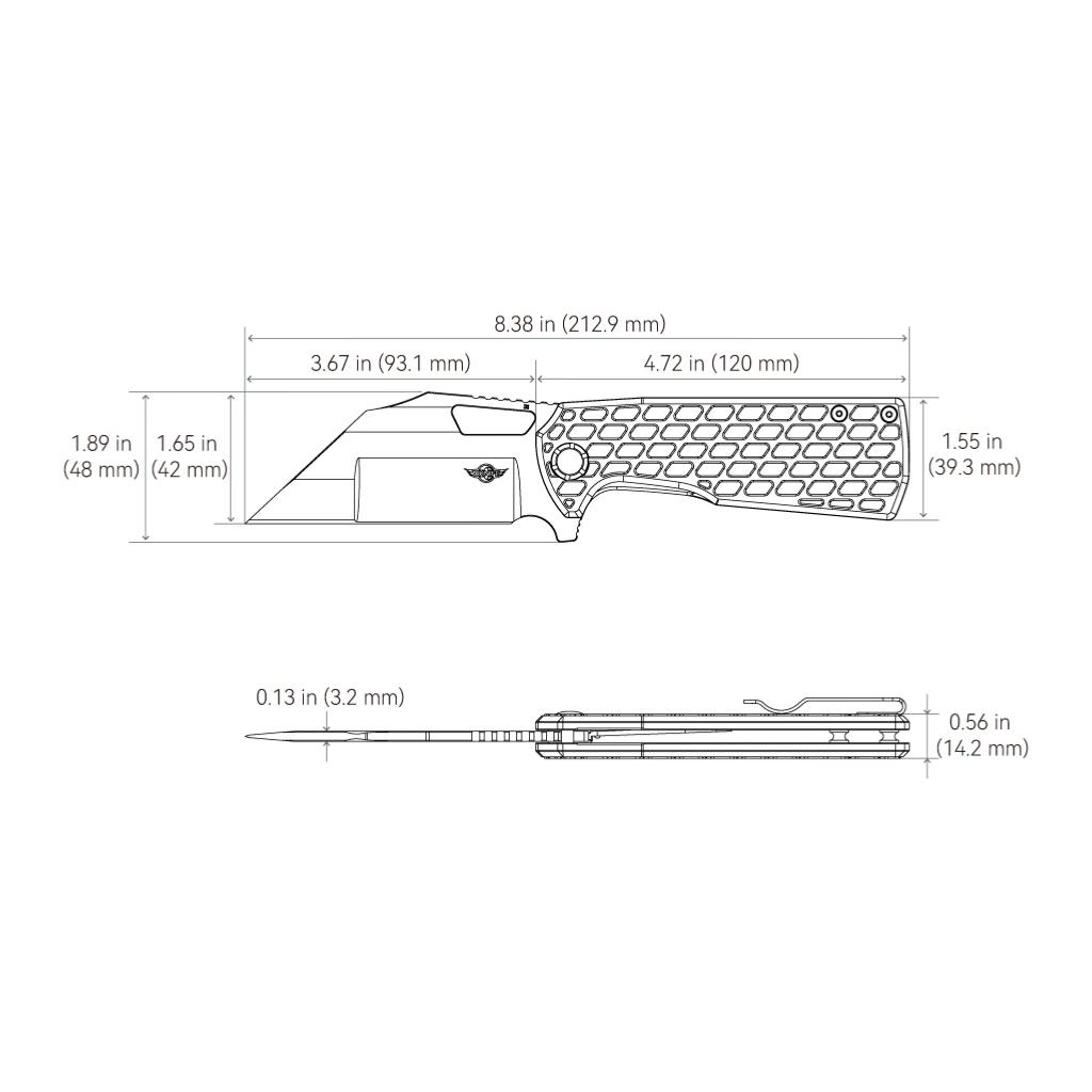 The modified wide Wharncliffe blade offers robust and versatile cutting power, ideal for piercing, slicing, and general cutting tasks.