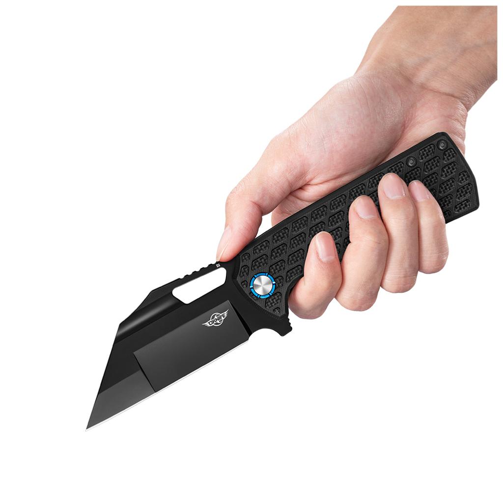 The modified Wharncliffe blade in D2 steel with a black titanium coating offers precise and durable cutting. The ball bearing system ensures smooth deployment.