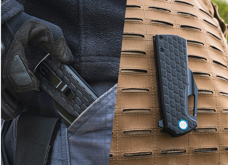 The G10 handle, which combines a rifle butt shape with a raised, textured parallelogram pattern and Olight's signature blue accents, not only makes this tactical folding knife stand out, but also offers a solid, exceptional grip.