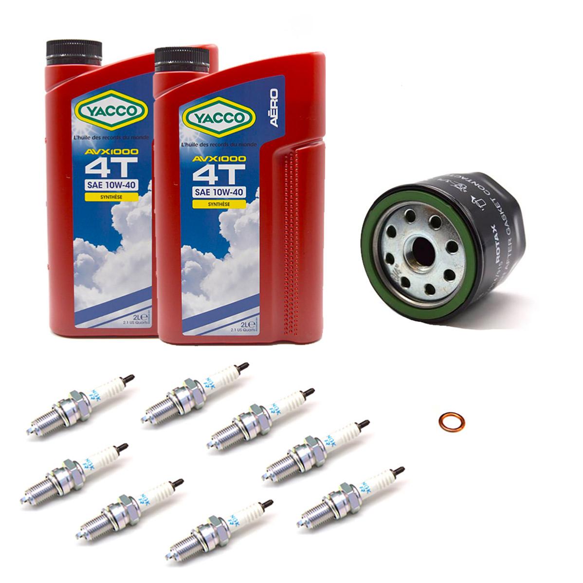 Pack for the 200 hour overhaul of a Rotax 912S 100 Hp engine. It includes 4 liters of Yacco AVX 1000 4T oils, 1 Rotax oil filter, 1 drain seal and 8 NGK DCPR8E spark plugs.