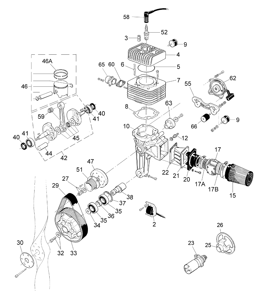 Exhaust gasket Spark plug Kit screws for head Set of silent-block Cylinder head Cylinder head gasket MINI 4 Kit screws for cylinder Cylinder Exhaust gasket Starter hub Cylinder head gasket Crank-case Starter hub Vacum-operated screw Reed valve gasket Reed valve Carburetor rubber manifold Walbro WB 37/C carburator Air filter's support Air filter Aluminium manifold Eccentric pinion Electric ignition and coil Pulley seeger Kit bearings for big pulley Pulley's bearing spacer Kit bearings for big pulley Pulley spacer Little pinion for reduction Screw and wascher for pinion Fire coil Poly-V belt Driven pulley Screw for big pulley Aluminium plate and screws Manual starter Starter hub Electric starter Electric starter Electric starter Complete piston Two rings Kit seals Kit bearings for crank-case Exhaust gasket Complete piston Complete cranck shaft Kit bearings for crank-case Kit seals