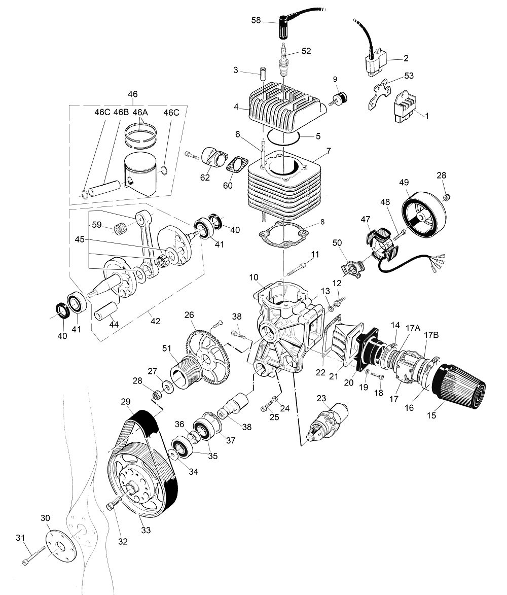 Cap of spark plug Mini 2 plus Spark plug for Mini 2 Plus NGKBR10ES Transducer (ignition coil) Aluminium support for coil rectifier / regulator Set of brace M8 Shock-mount MF M8 x A40 x B28 Cylinder head Mini 2 Plus O-ring for head cylinde Mini 2 cylinder after n°3862 Kit of stud for head cylinder Exhaust gasket MINI 2 and MINI 4 Exhaust manifold Mini2 Piston axis Mini 2 plus Peer of segment mini 2 plus Piston, piston ring, clip axis Needle bearing Set of 2 gaskets SPY MINI 2 Set of bearings for crankshaft axis Link mini 2 plus + bearings Set of bearings for crankshaft axis Set of 2 gaskets SPY MINI 2 Cylinder gasket Mini 2 and Mini 4 Pack of M6 screws for crankcase Crankshaft with link + bearings Nut for primary pulley Wheel Mini 2 Plus Screw for stator Mini 2 plus Stator for mini 2 plus Support plate for stator Mini 2 plus depression plud M6x6 Gasket for depression plug Air filter Mini 2 and Mini4 Support for air filter Carburettor WALBRO WB 37 Brace for carburettor WB 32 pipe clamp Set of Screws for admission manifol Manifold carburetor support Valve admission box Gasket valve admission box Crankcase Mini 2 Plus Eccentrix secondary axis Circlips secondary pulley Set of bearings secondary pulley Distance ring Electric starter SIM 3000W Dx16 Eccentrix secondary axis Starter crown Pulley for reducer Mini 2 plus Washer for primary pulley Nut for primary pulley Belt Poly-V J508 14 teeth Secondary pulley Mini 2 plus Eccentric setting screw Flabby propeller Mini 2