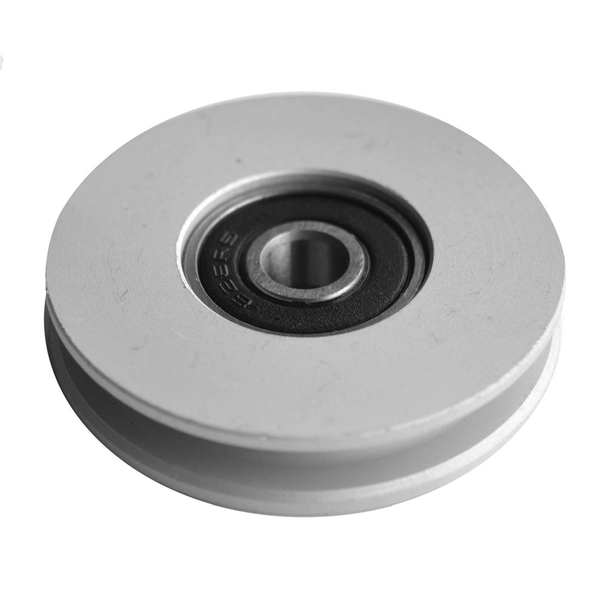 Anodized aluminum pulley for 2.5 and 3 mm cable, axis of 6 mm. Weight: 30 g Bearing's length: 6 mm Pulley's length: 8 mm