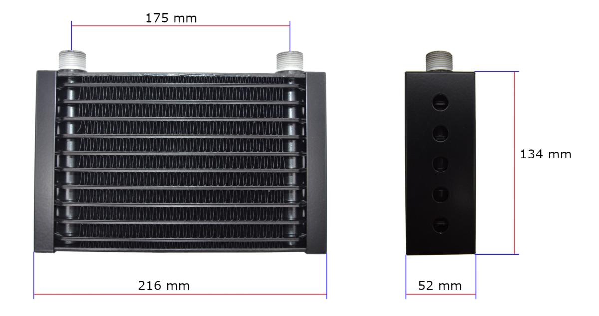 Adaptable oil heating for Rotax engine. Output center-to-center distance: 175 mm. Dimensions: 216 x 134 x 52 mm. Weight: 820 gr. Delivered with 4 fixation bolt and 2 90° outputs.