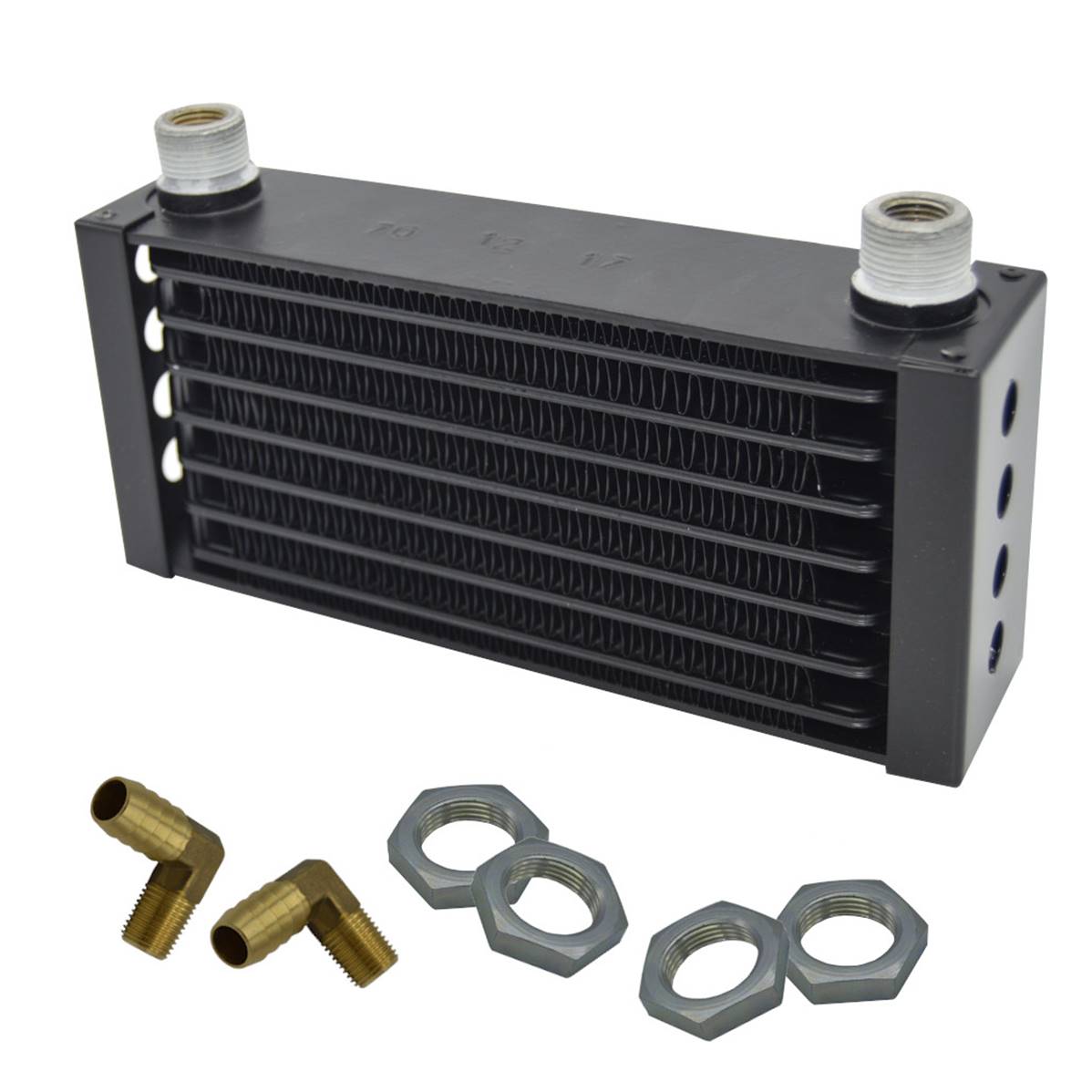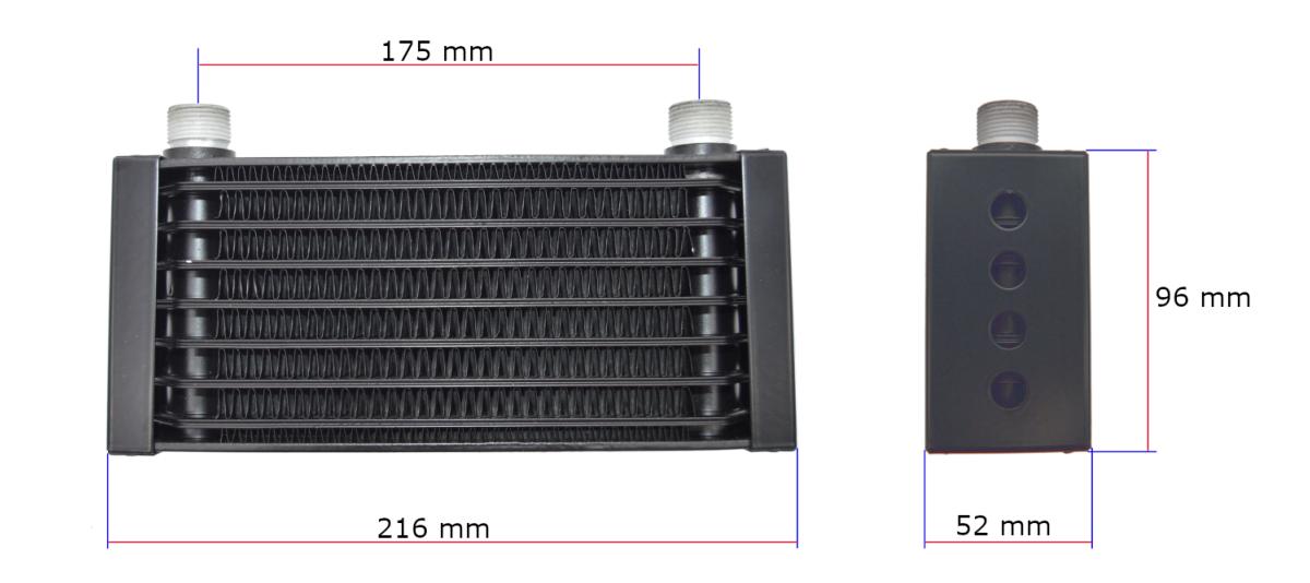 Adaptable oil heating for Rotax engine. Output center-to-center distance: 175 mm. Dimensions: 216 x 96 x 52 mm. Weight: 610 gr. Delivered with 4 fixation nuts and 2 90° outputs.