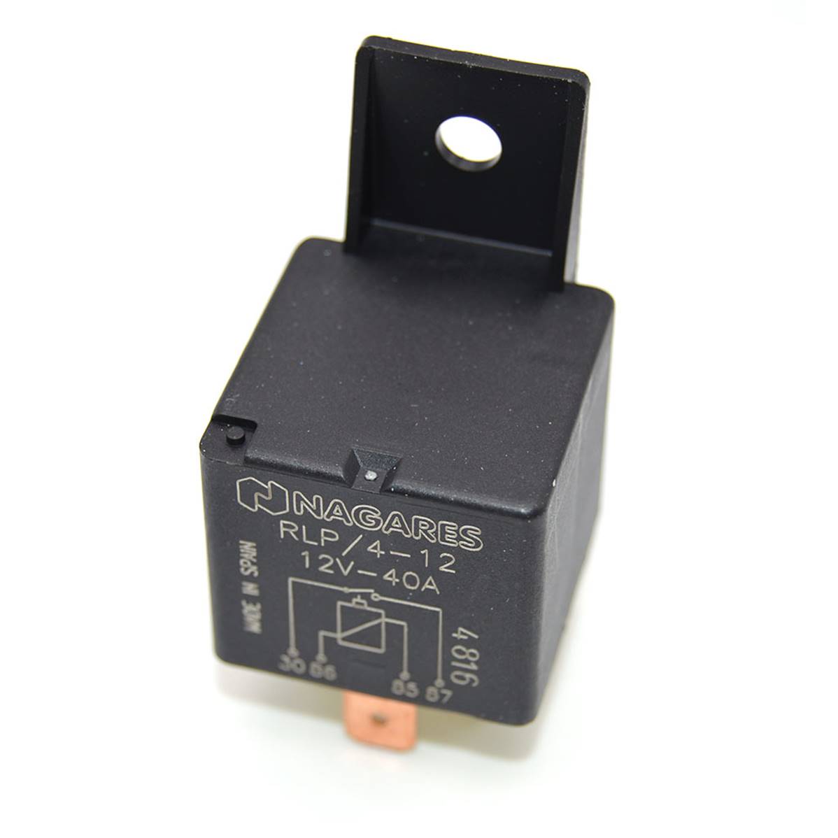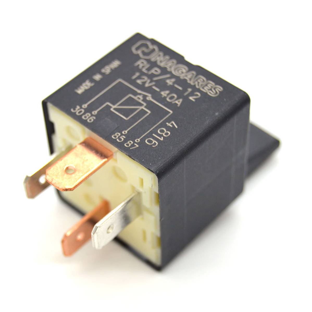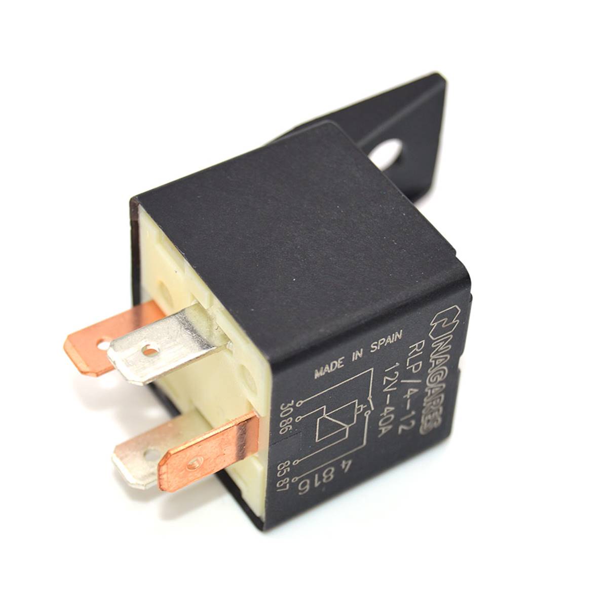 12 V - 40 A relay for onboard electrical circuits. Used for remote control of high-power equipment (fuel pump, ventilation, lighting, instruments). Metal mounting tab and flat terminal for easy integration into wriing harnesses.