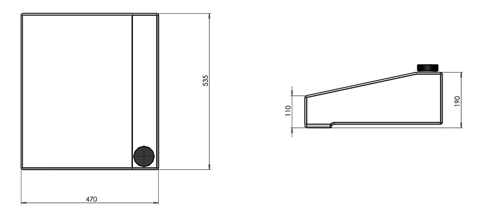 Fuel tank (straight) for polyethylene wing, 35L capacity. Filling conduit diam 50 mm. A location is planned for the fuel gauge. Predict fuel output accessory. It can be settled differently in other configurations. Dimensions: Width: 535 mm, depth: 470 mm, maximum height: 190 mm and minimum: 110 mm. Weight: 2.600 kg.