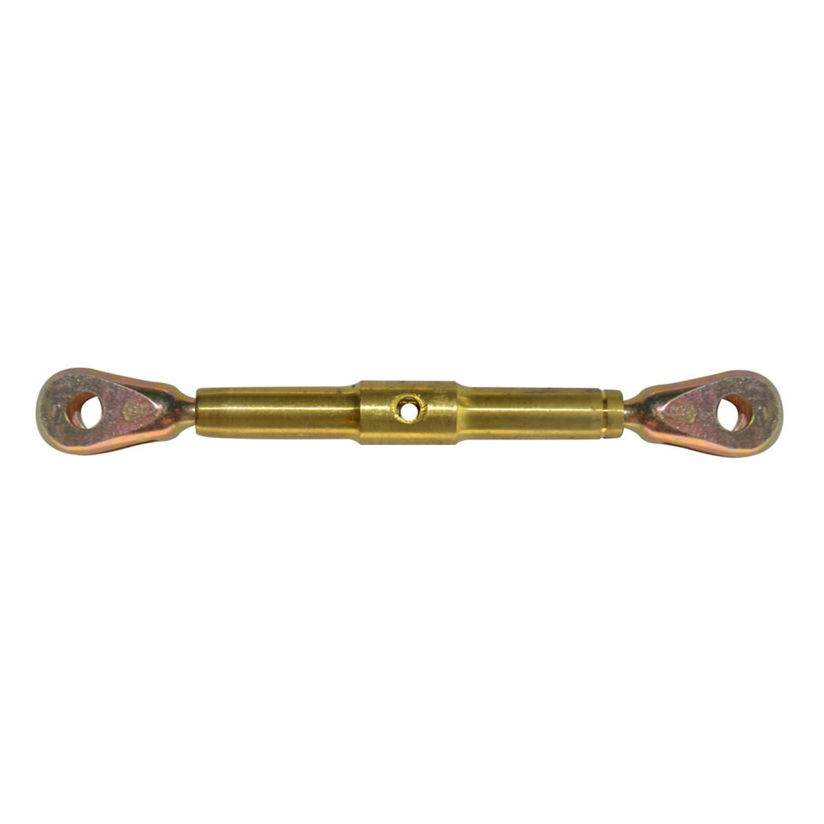 Brass turnbuckle with a side eye on each side, using minimal length 90 mm resisting to 725 kg traction.