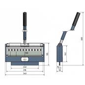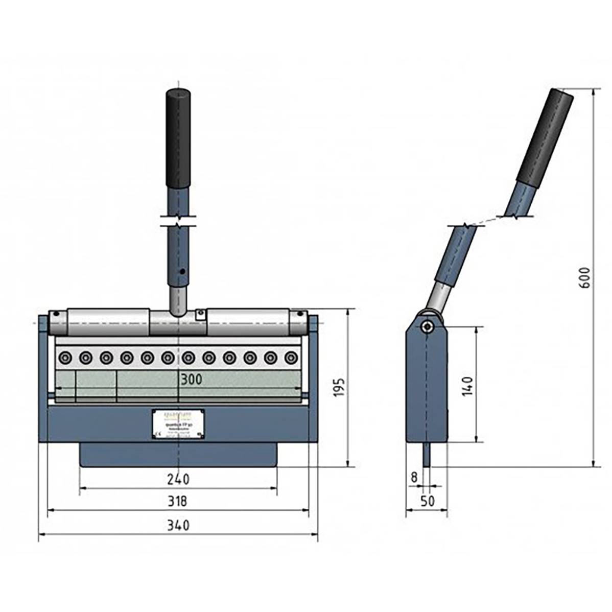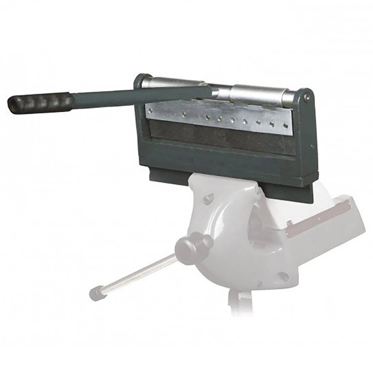 Folding machine for bending and bending thin sheet metal, removable segment of different widths, easy forming thanks to the ergonomic handle and of great length, fixed in a bench vice. Width of workpieces: 320 mm.