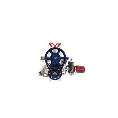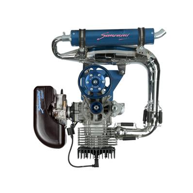 | (Code: 76013-SUPER) Victor 1 Super Simonini engine, including : the exhaust pipe, the carburetor, the air filter, the electric starter, and the reducer 1/ 1,268 or 1,284 or 1,30. Power: 44CV on 6200 lap/min. Type 2T single cylinder. Water cooling system. Rotating direction: counterclockwise seen from the propeller side. Cylindered 362 CC. Cylinder made with alloy treated with Nikasil. Speed x bore 72 mm x 80 mm. Compression ratio 9,50/1. Performance: 48CV on 6200 lap/min. Lubrication. Fuel/2% oil mixture, 95 Euro fuel. Double starter Ducati, carburetor with Bing 36 air filter. Electric starter 12V – 400W. Exhaust: Yes. Poly V 1/ 2,84 or 1/ 2,68 or 1/ 3,0 belt reducer. Full weight: 32 kg