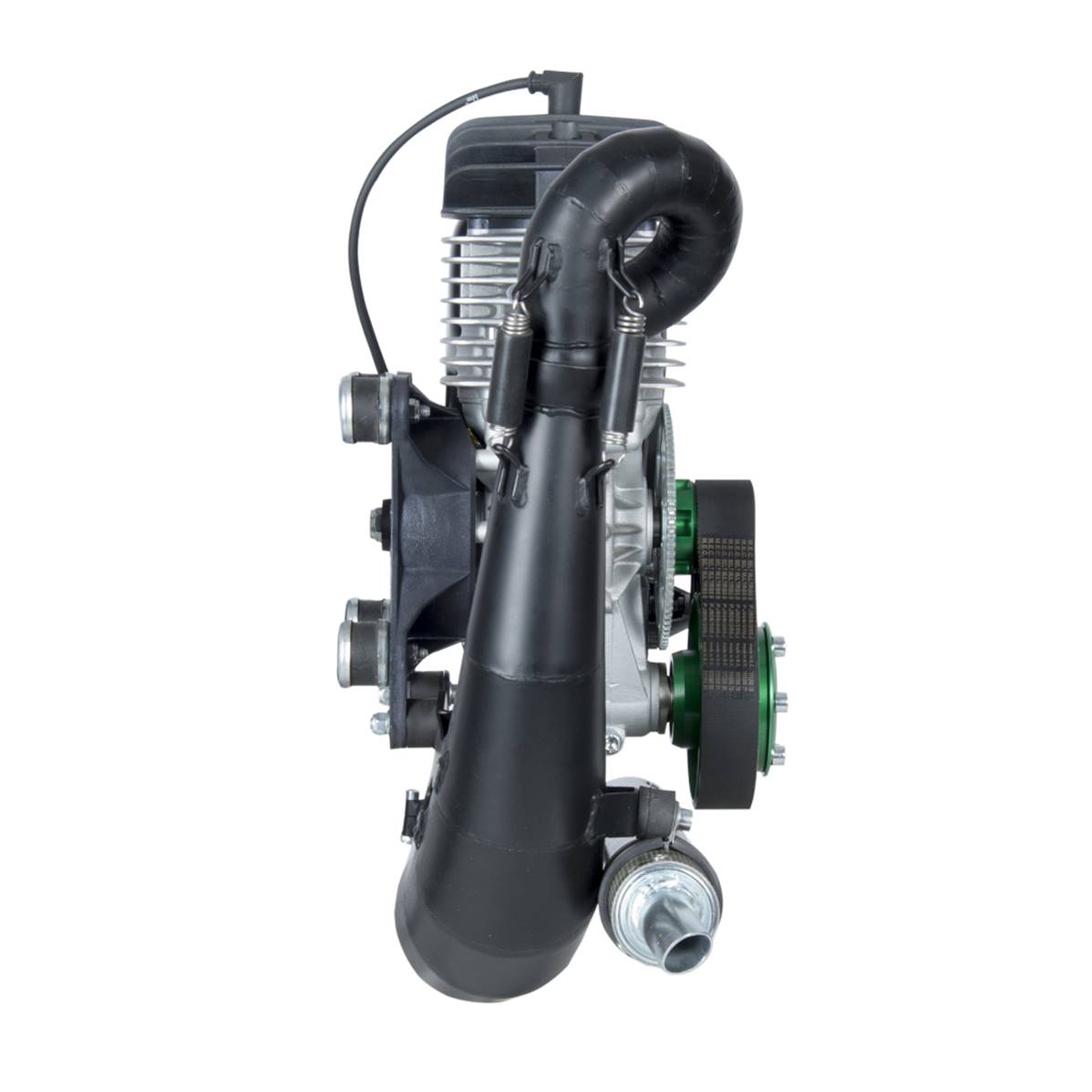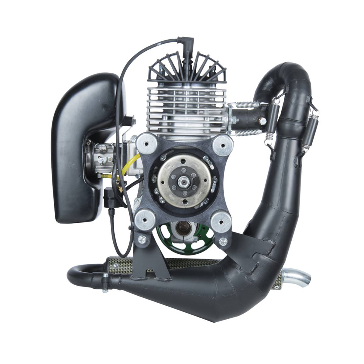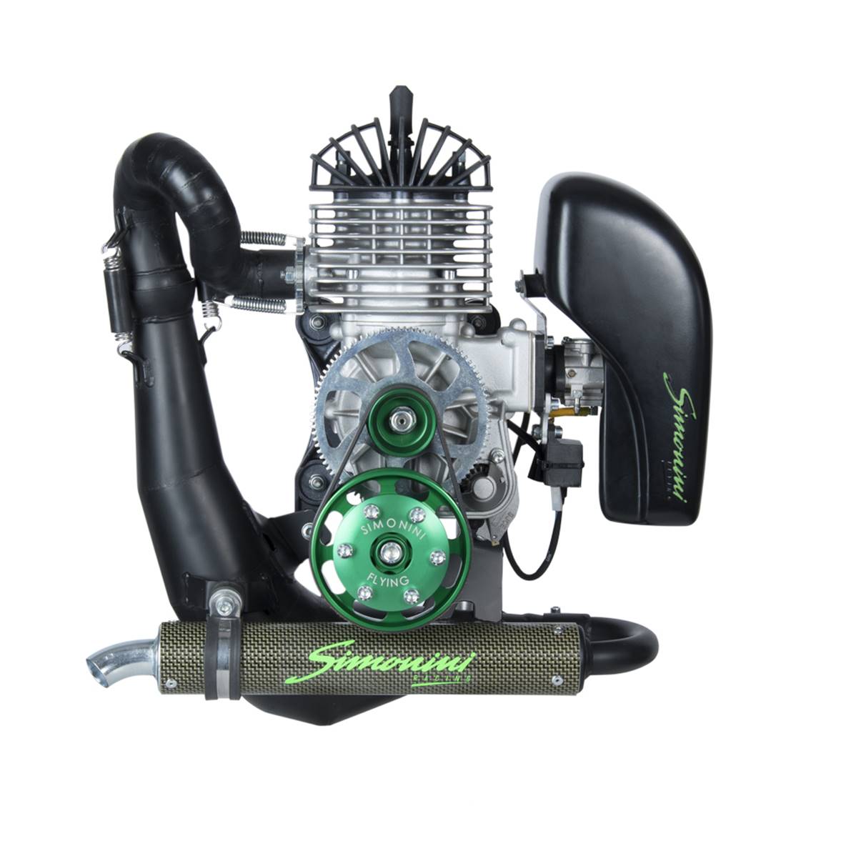 The last one of the Simonini range, the MINI2 EVO is more powerful than the MINI2 Plus for the same weight, it allows taking off a two-seater with more facility. Standardly delivered with the electric starter, exhaust pipe with noise killer, Walbro WB 37 carburetor, air filter, a reducer and 2 silent bloc kits (1 for the engine and 1 for the noise killer).Reloading the battery is possible (alternator). Type 2T single-cylinder, air cooling system, rotating direction counterclockwise seen on the side propeller. Cylindered 231 CC. Cylinder made with alloy treated with Nikasil. Speed x bore 60 mm x 70 mm. Compression ratio 10 / 1, performance 33 CV on 8000 lap/min. Lubrication: fuel / oil 3% mixture. Consumption: nearly 4l/h according to the power. Euro 95 fuel. Starter: IDM transducer Carburetor with air filter: Walbro WB37. Ignition: Electric. Exhaust pipe: yes. Reduction: Poly V belt. Possible reduction: 1:230 – 1:234 – 1:240 – 1:31 – Thrust: 90 kg with two-bladed propeller 130 cm – Full weight: 17 kg