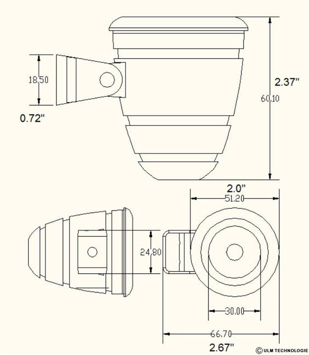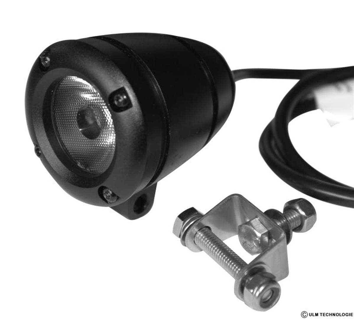Waterproof landing LED light – 10 W – Light beam: 5000k on 45° - Black aluminum element with stainless support – 9 to 30 Volts – Weight: 230 gr – Diam 50 mm – Height with support: 55 mm – Cable length: 60 cm – Amperage: 1A – Consummation from 0.6 A to 12 V