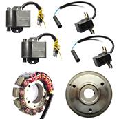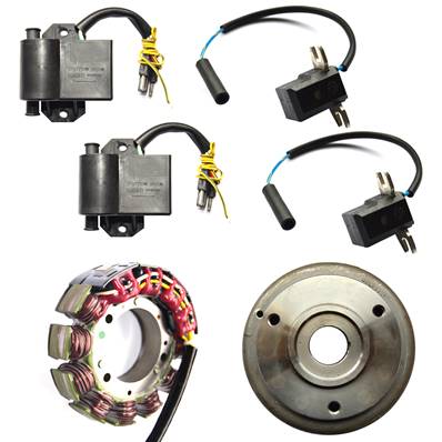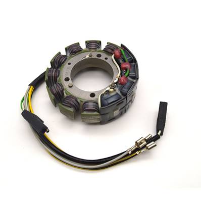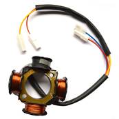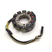 Stator equipping the same motor as above. A coil products the impulsion for the ignition, other produce alternative current which, through a regulator, proposes 12V in order to charge a battery for instance.