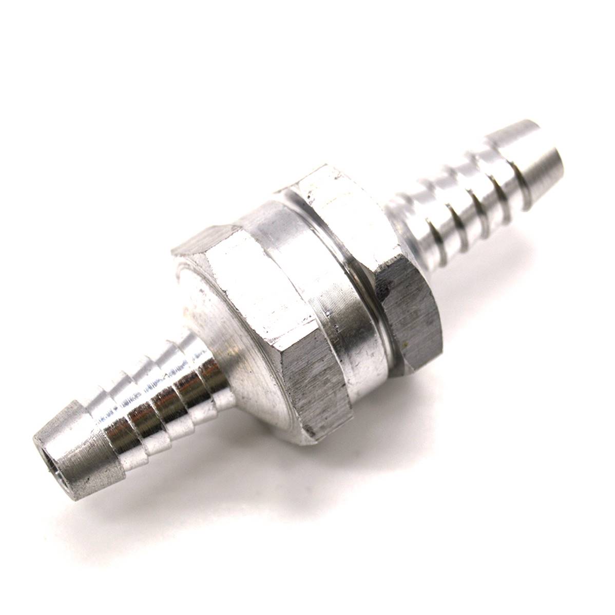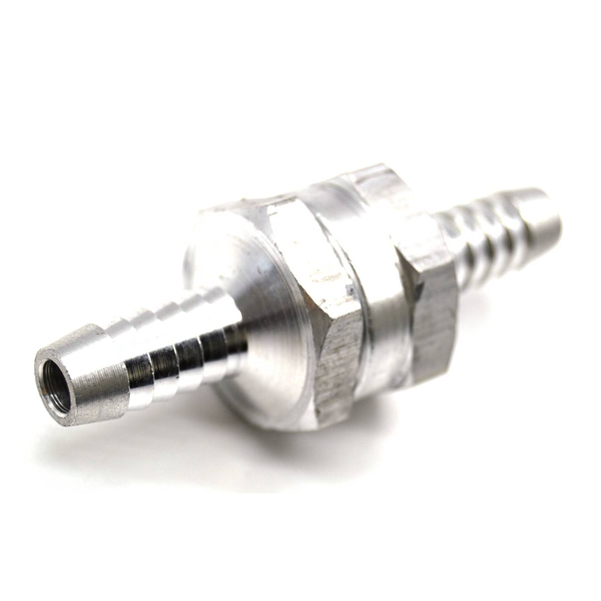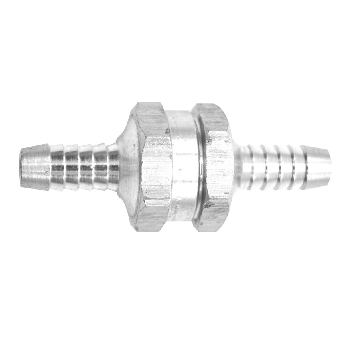 Non-return valve, diam 6 mm, made with aluminum, avoid defusing the fuel circuit. In case of two wing tanks, the non-return avoids that one bleeds out in the other. Weight: 35 gr