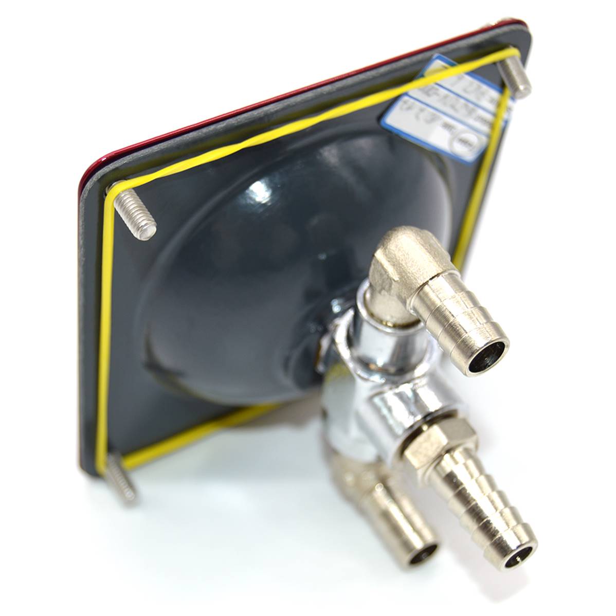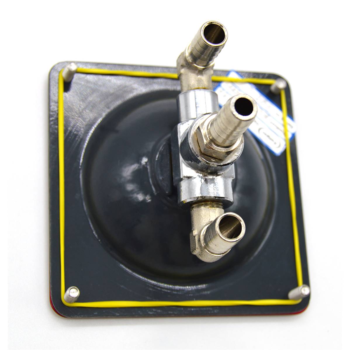 Fuel 3 ways valve – 90 x 90 mm. Output diam 8 mm – Drilling diameter : 67 mm – Height under sheets: 70 mm – Weight: 190 g.