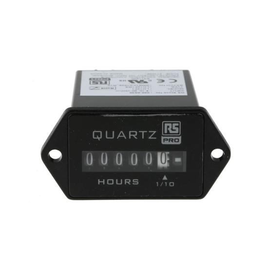 Rectangular quartz hour meter with mechanical display in 1/10 hour increments. Suitable for tracking engine operating time and maintenance schedules. Compact format for easy panel or bracket installation.