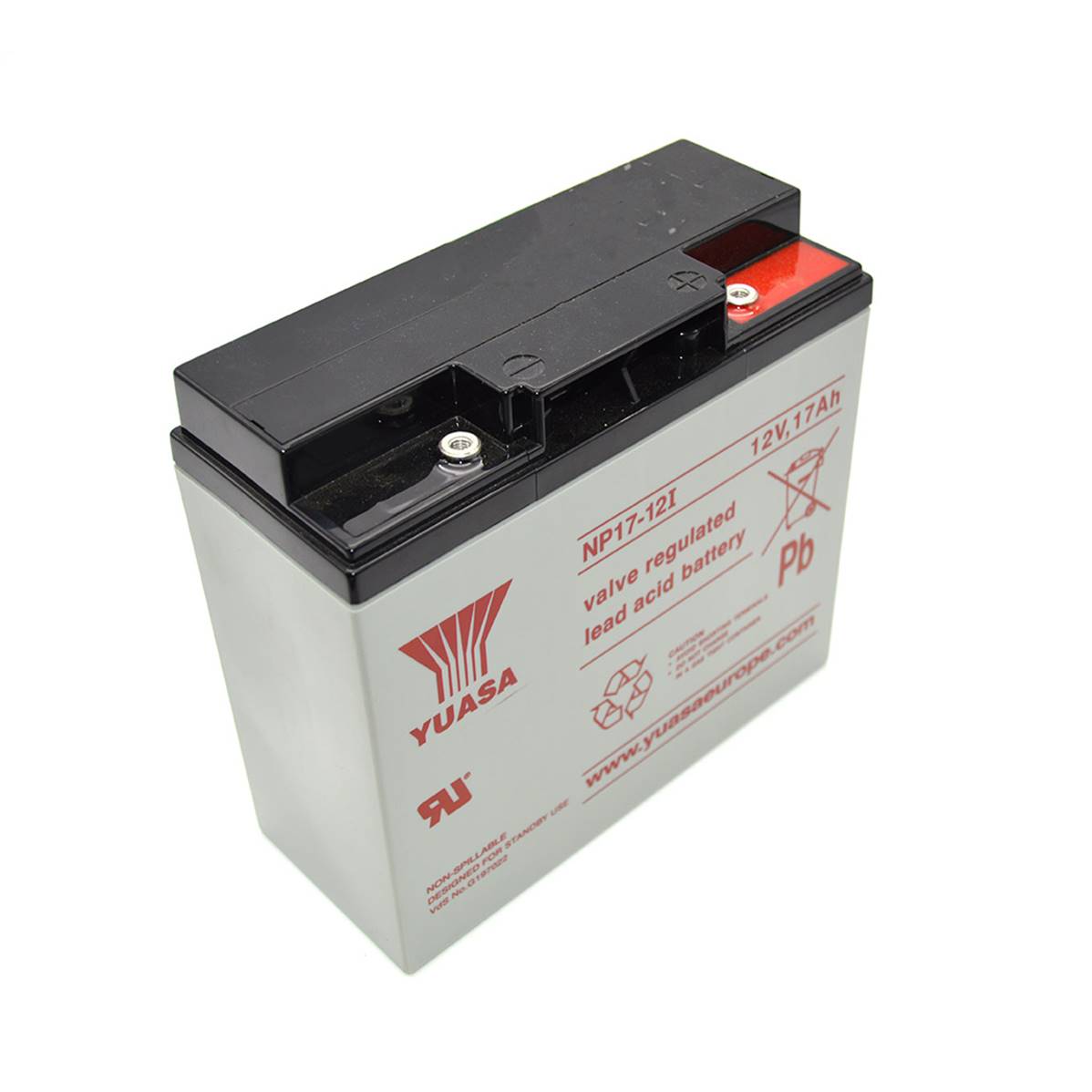 YUASA battery 12 V – 17 Ah. Dimension : 17 Ah = 181 x 76 x 167 mm – Weight : 6.410 kg. Thanks to both its unique construction and the waterproof technique, Yuasa guarantee that no electrolyte leakage can happen, either by pods or the case. Maintenance-free. Great recuperation after a deep discharge. Gas total recombination, operates in any positions. Superior energy density, great lifetime thanks to PB-ca plates.